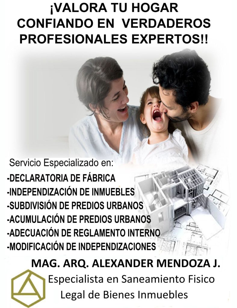 PERITO ESPECIALISTA EN EL SANAMIENTO FISICO LEGAL DE INMUEBLES CON MÁS DE 20 AÑOS DE EXPERIENCIA. CONSULTOR Y CAPACITADOR EN DIFERENTES INSTITUCIONES PARA: DECLARATORIAS DE FABRICAS, INDEPENDIZACIONES, SUBDIVISIÓN Y ACUMULACIÓN DE PREDIOS URBANOS.